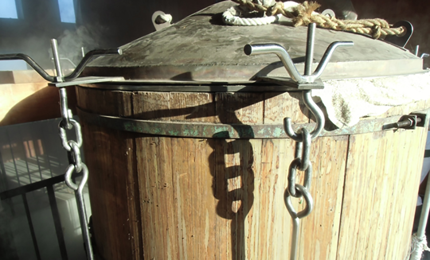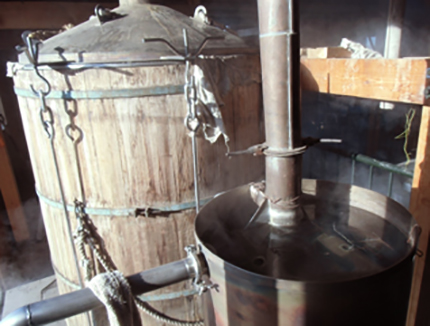 釜の中にハッカを十分に敷き詰めたら、フタを閉め、水蒸気をあてていきます。