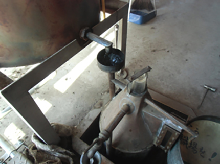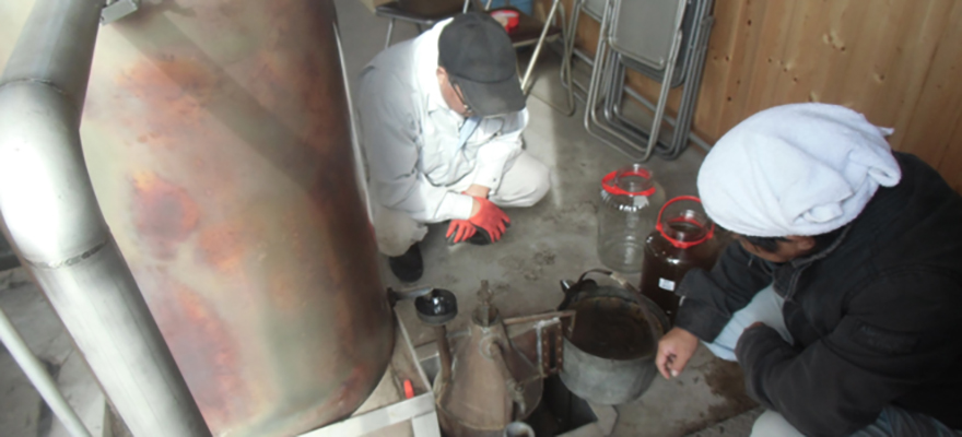 蒸留後、釜をあげて敷き詰めたハッカを取り出します。 この一連の作業を数回繰り返します。