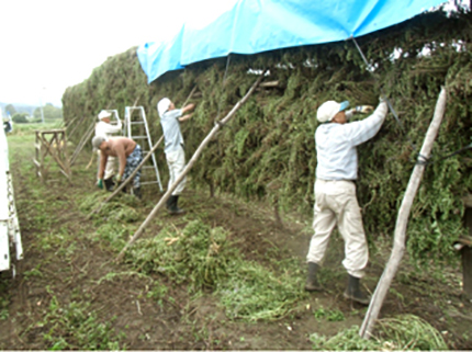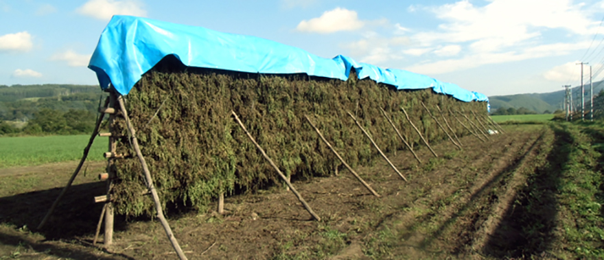 刈り取ったハッカを小まめにまとめて、はさがけ作業に続きます。